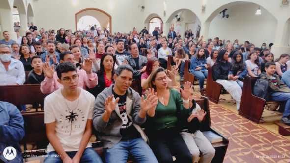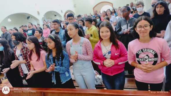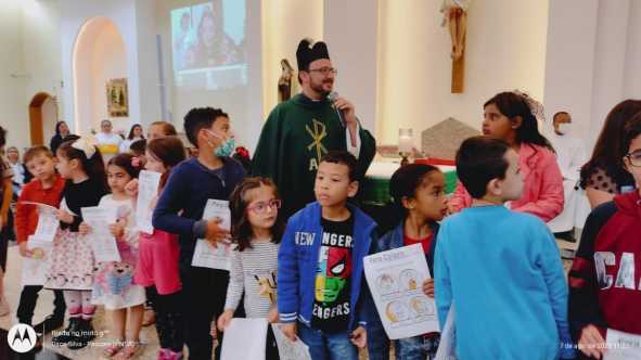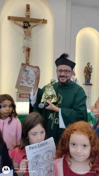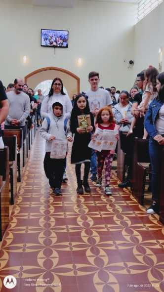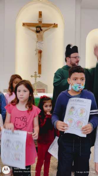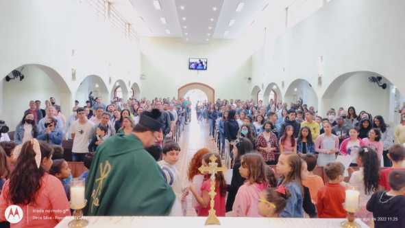 A Missa foi celebrada pelo pároco, padre Ton Ferreira, que no início da missa chamou as crianças da pré-catequese até o presbitério, para saírem com a catequista Márcia Massuia. Durante o período da Missa, as crianças ouviram sobre o tema das Vocações e receberam desenhos para serem coloridos.