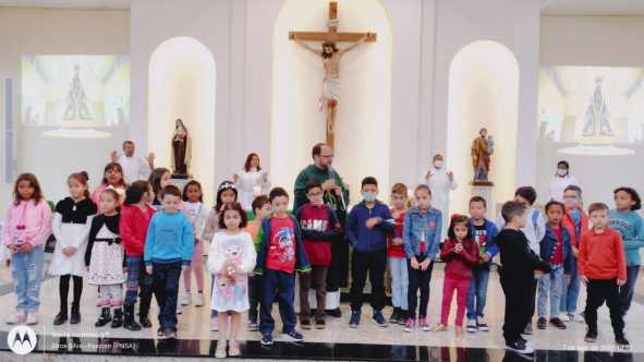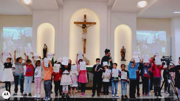 Ao final da Missa, padre Ton chamou as crianças novamente para o interior da igreja, onde elas apresentaram o trabalho realizado.