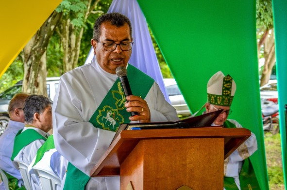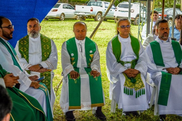 A missa foi presidida por Dom Arnaldo (ao centro) e concelebrada por Dom Vicente (à esq.) e pelo pároco, padre Ton (à dir.), além de outros sacerdotes e diáconos.