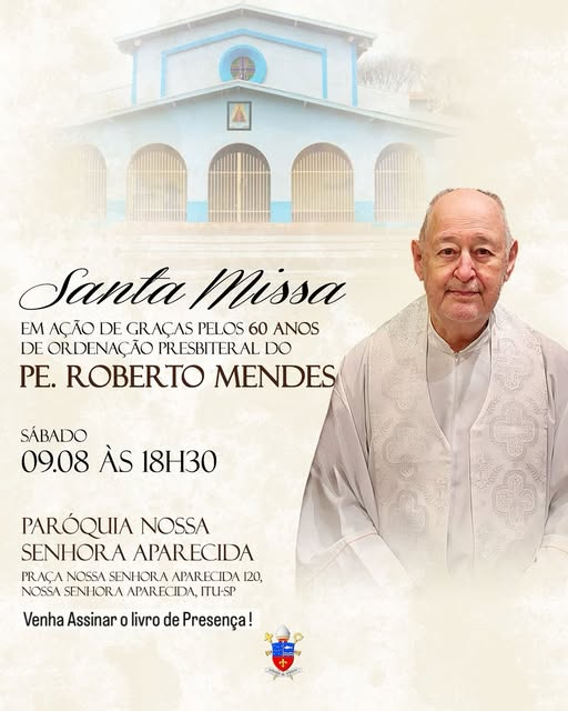 A Paróquia Nossa Senhora Aparecida celebra neste sábado (09/08) uma missa em Ação de Graças pelos 60 anos de ordenação presbiteral de seu pároco emérito, padre Roberto Mendes. O sacerdote, que hoje reside na Casa dos Presbíteros, em Jundiaí, concelebrará a missa, que será presidida pelo pároco, padre Ton.