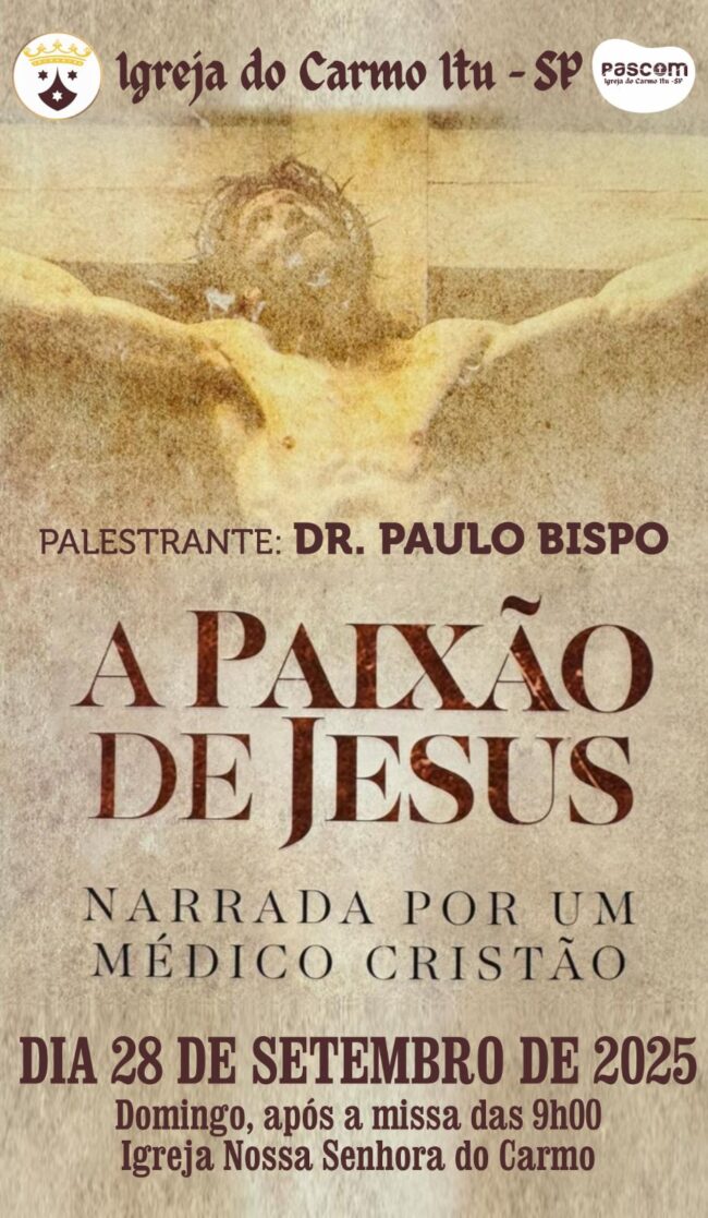 “A Paixão de Jesus narrada por um médico cristão” será o tema de uma palestra realizada neste domingo (28), na Igreja Nossa Senhora do Carmo. O evento é gratuito é aberto a todos os interessados.