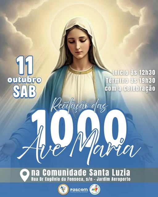 A Recitação das 1000 Ave-Marias acontece na Comunidade Santa Luzia, no Jardim Aeroporto, neste sábado (11), a partir das 12h30, encerrando com a Celebração, às 19h30.