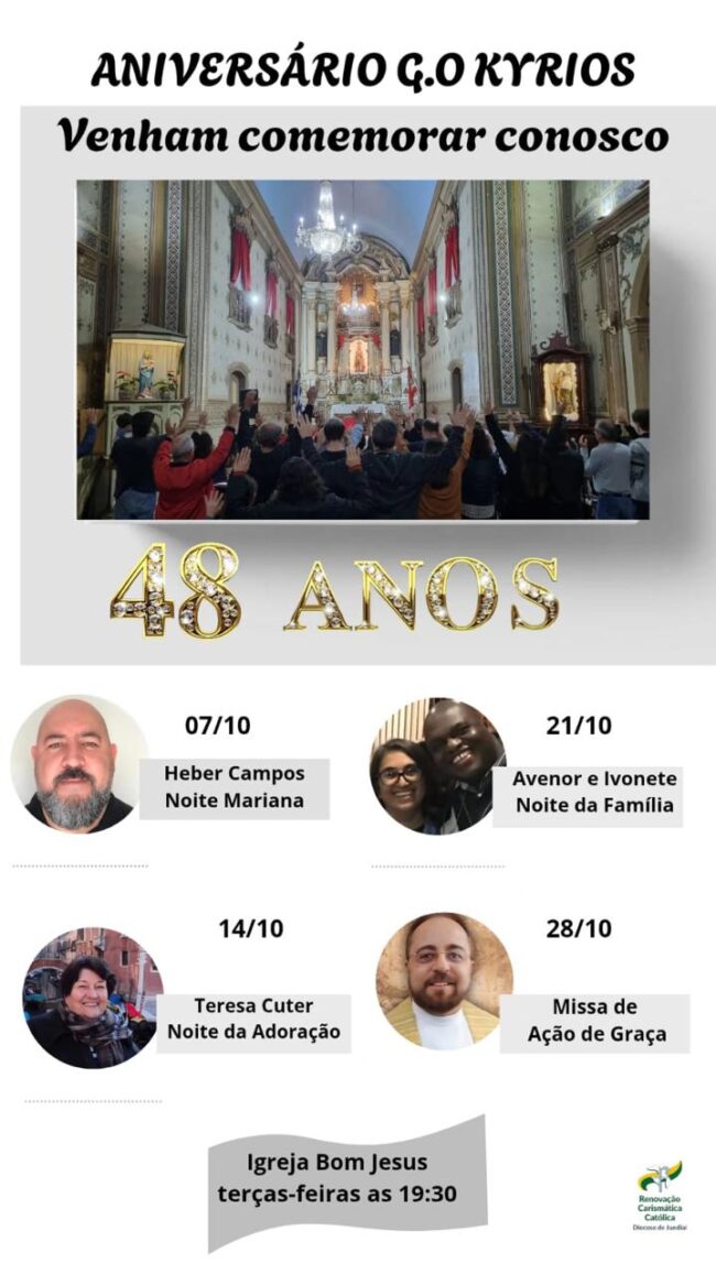 Neste mês de outubro, o Grupo de Oração Kyrios completa 48 anos de existência. Para celebrar a data, uma programação especial foi montada para os encontros semanais ao longo do mês.