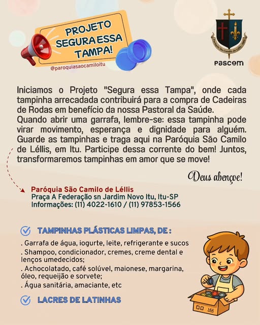 A Paróquia São Camilo de Léllis está lançando a Campanha “Segura essa Tampa!”, com o objetivo de arrecadar tampinhas plásticas e lacres de latas metálicas, cuja renda será revertida em cadeiras de rodas a serem utilizadas pela Pastoral da Saúde da paróquia.
