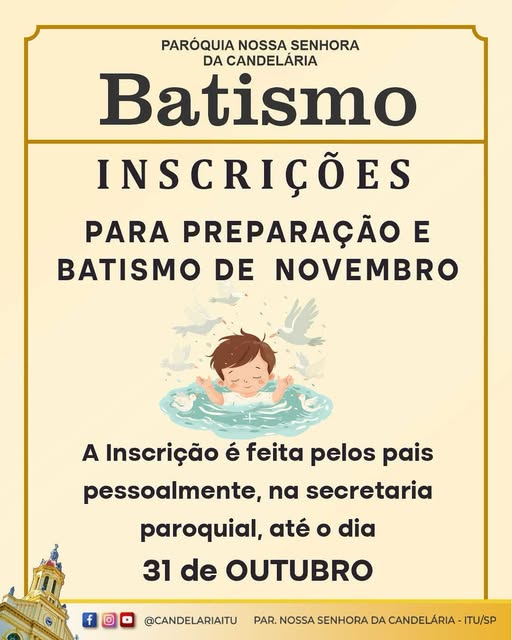 Terminam na próxima sexta-feira (31/10) as inscrições para a cerimônia do Batismo que acontecerá no mês de novembro na Paróquia Nossa Senhora da Candelária.