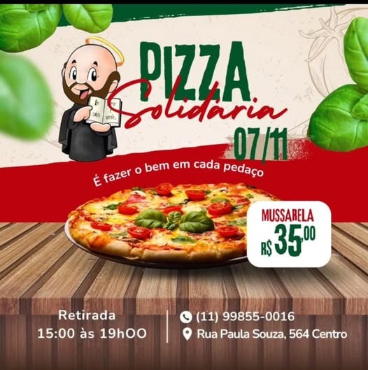 A Pizza Solidária do Lar Santo Inácio será realizada na próxima sexta (7), com retirada das 15h às 19h. As pizzas de muçarela semiprontas, para serem assadas em casa, estão sendo vendidas antecipadamente, por R$ 35 cada pizza. Informações e vendas: (11) 99855-0016.