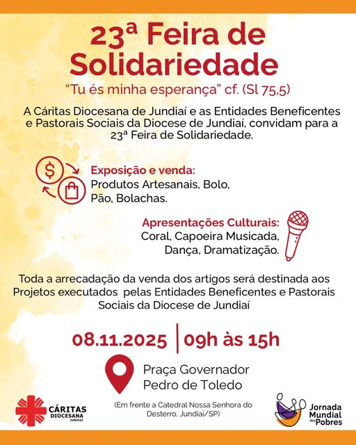 A Cáritas Diocesana, as entidades beneficentes e as pastorais sociais da Diocese de Jundiaí realizam neste sábado (08/11) a 23ª Feira da Solidariedade, em Jundiaí. O evento contará com apresentações artísticas, exposição e venda de produtos.