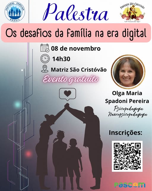 Acontece neste sábado (08/11) a palestra “Os Desafios da Família na Era Digital”, promovida pela Paróquia São Cristóvão. Voltada especialmente para pais e famílias, a palestra será ministrada pela psicopedagoga, neuropsicopedagoga e terapeuta ocupacional Olga Maria Spadoni Pereira. Ela faz parte da Pastoral Familiar Diocesana e é coordenadora da Comissão de Defesa da Vida da Diocese de Jundiaí.