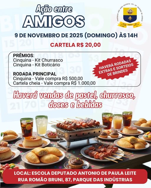 Acontece neste domingo (09/11) a Ação entre Amigos da Paróquia Sâo João Batista. O evento contará com vários prêmios, vale-compras e rodadas extras, com renda revertida para as atividades da paróquia.