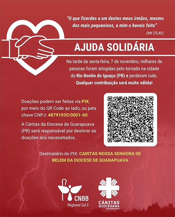 Nesse cenário de dor e urgência, a Cáritas Diocesana de Guarapuava, em articulação com o Regional Sul 2 da CNBB, lançou uma campanha de ajuda solidária para arrecadar recursos destinados às famílias atingidas. As doações podem ser feitas via PIX, pela chave CNPJ: 48791935/0001-60, ou pelo QR Code disponível na imagem abaixo. O destinatário pix é: CÁRITAS NOSSA SENHORA DE BELÉM DA DIOCESE DE GUARAPUAVA.
