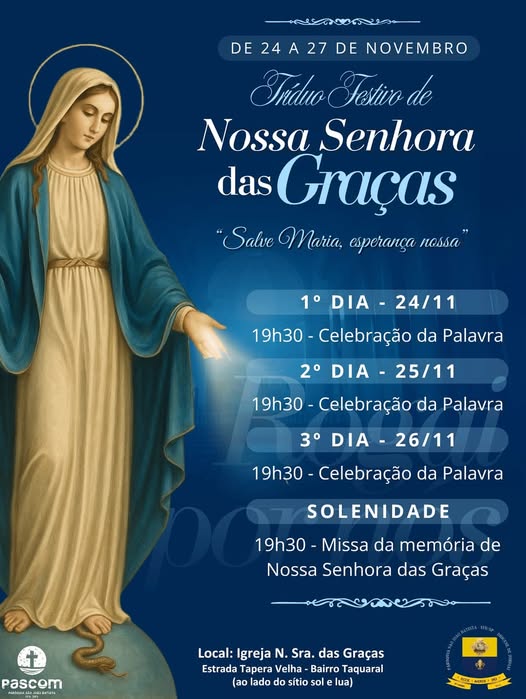 A Comunidade Nossa Senhora das Graças, que pertence à Paróquia São João Batista, realiza o Tríduo em honra à padroeira de segunda (24) a quarta (26), com celebrações da Palavra às 19h30. A solenidade será celebrada na quinta (27), dia dedicado a Nossa Senhora das Graças, com Missa Solene, às 19h30.