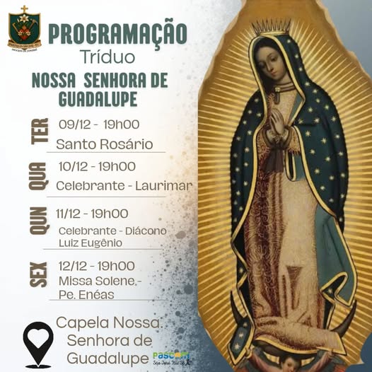 Pertencente à Paróquia São José, a Comunidade Nossa Senhora de Guadalupe inicia as celebrações em honra a sua padroeira com o Tríduo: de terça (9) a quinta (11), às 19h. Na sexta (12), haverá Missa Solene às 19h.