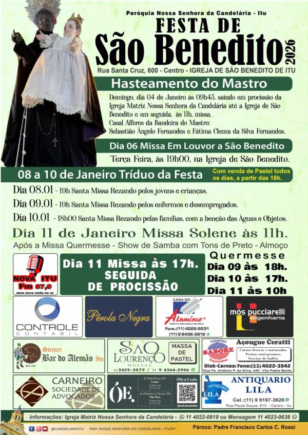 Termina neste final de semana a tradicional festa em honra a São Benedito, na igreja que tem o santo como padroeiro, no centro da cidade. As comemorações contam com Tríduo, Missa Solene e a tradicional Procissão em louvor ao santo, que acontece neste domingo (11/01).