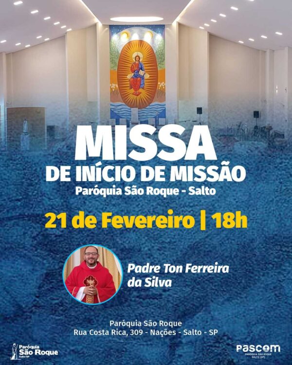 A missa de início de missão de padre Ton acontecerá no sábado (21), às 18h, na Igreja Matriz São Roque, localizada na rua Costa Rica, 309, Jardim das Nações, em Salto. A missa será transmitida pelas redes sociais da Paróquia Nossa Senhora Aparecida, de Itu.